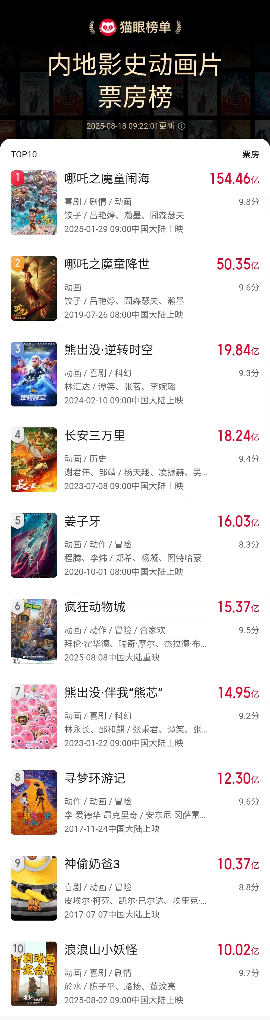 上证报中国证券网讯(记者 杨翔菲)据猫眼专业版数据,截至8月18日9时,电影《浪浪山小妖怪》累计票房已突破10.026亿元,超过《功夫熊猫3》,进入中国影史动画电影票房榜前十。